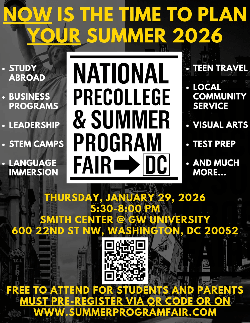 The National Precollege & Summer Program Fair: Washington DC is a free event for high school students and their families looking to discover their summer 2026. This in-person event will showcase over 100 ways high school students can spend this summer, including on-campus pre-college programs at the nation's most prestigious universities, study abroad opportunities, STEM programs, entrepreneurship mentorships, teen travel, visual arts, test prep, local nonprofits seeking summer volunteers, and much more!