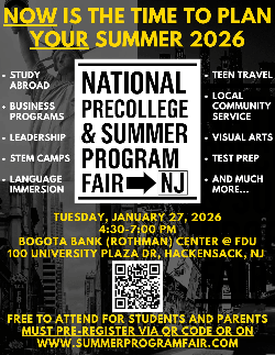 The National Precollege & Summer Program Fair: NJ is a free event for high school students and their families looking to discover their summer 2026. This in-person event will showcase over 100 ways high school students can spend this summer, including on-campus pre-college programs at the nation's most prestigious universities, study abroad opportunities, STEM programs, entrepreneurship mentorships, teen travel, visual arts, test prep, local nonprofits seeking summer volunteers, and much more!