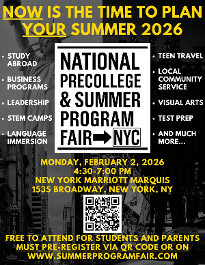 The National Precollege & Summer Program Fair: NYC is a free event for high school students and their families looking to discover their summer 2026. This in-person event will showcase over 100 ways high school students can spend this summer, including on-campus pre-college programs at the nation's most prestigious universities, study abroad opportunities, STEM programs, entrepreneurship mentorships, teen travel, visual arts, test prep, local nonprofits seeking summer volunteers, and much more!